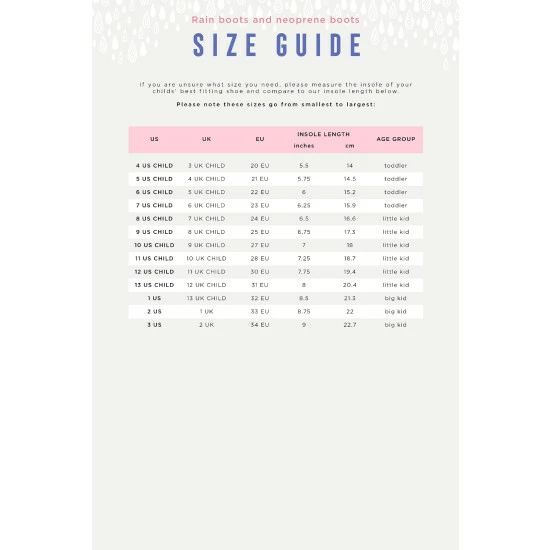 | Size | 3 EU 19, 4 EU 20.5, 5 EU 21.5, 6 EU 23, 7 EU 24, 8 EU 25.5, 9 EU 26.5, 10 EU 28, 11 EU 29, 12 EU 30.5, 13 EU 32, 1 EU 33, 2 EU 34.5 |
